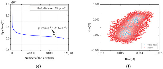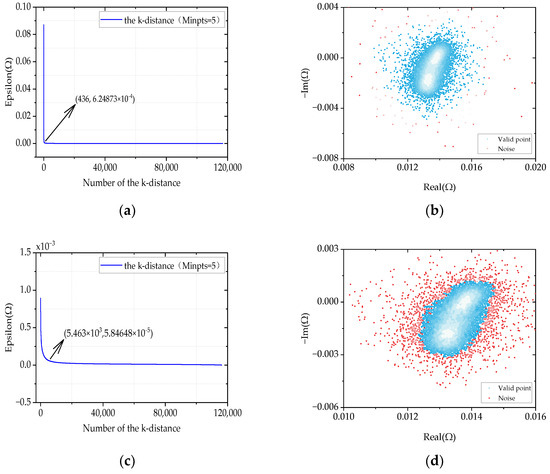 The impedance calculations in the high-frequency interval were taken as an example to verify the process of parameter selection and data processing in Section 3. As shown in Figure 7a, Minpts1 was set to 5 to construct the k-distance (k = 5) curve for data in the high-frequency interval, and the curve’s inflection point was selected as Eps1. The first clustering was carried out using the parameters above, and the results of the data discrimination are shown in Figure 7b.