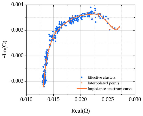 After the effective clusters had been formed, interpolation was used to extend the relationships between the impedance data points of known frequencies to those of unknown frequencies. This resulted in a smooth impedance spectrum curve, as shown in Figure 8. The interpolated impedance spectrum offered more detailed and smoother information on the frequency response.