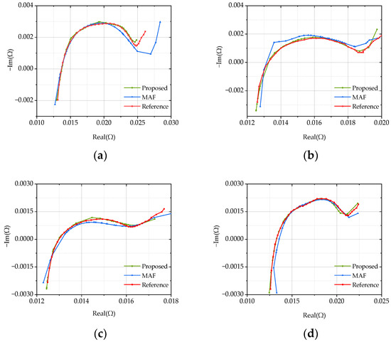 The root mean square error (RMSE) and the mean absolute percentage error (MAPE) were used to evaluate the overall error for the impedance curves after data processing. The impedance results of the lithium-ion battery in four cases are shown in Figure 9. The superiority of the proposed method was highlighted by calculating the RMSE and MAPE for the high-, medium-, and low-frequency intervals. The MAPE of the impedance in the low-frequency range obtained by the proposed method was 0.0668 when the lithium-ion battery was at 15 °C and the SOC was 50%, while the MAPE obtained by the MAF was 0.3127, which is 4.6 times higher than that of our method. As shown in Figure 9a, it can be noticed that the impedance data obtained by the MAF in the low-frequency range were far from the reference. An increase in temperature affected the impedance spectrum of the lithium-ion battery in the mid-frequency range. At 25 °C, the MAPE of the mid-frequency range measured by the MAF was twice that of the proposed method, as seen in Figure 9b. When the temperature was 35 °C, the gap between the two methods increased further, as shown in Figure 9c. The MAPE of the impedance spectrum in the mid-frequency interval measured by the MAF (0.0704) was five times higher than that of the proposed method (0.0141). Figure 9d shows the case where the Li-ion battery had SOC = 80% and T = 25 °C. It is clear that the proposed method still had significantly high accuracy, while the impedance spectrum measured by the MAF showed a large deviation in the high-frequency range. Thus, the proposed multi-density clustering method has good computational accuracy in different cases.
