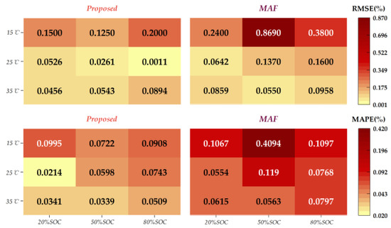 The RMSE and MAPE of the two methods in different cases were compared, as shown in Figure 10. When the lithium-ion battery was at an ambient temperature of 15 °C and 50% SOC, the difference in RMSE and MAPE between the two methods was the largest. The RMSE and MAPE of the proposed method were reduced by 85.6% and 82.3% compared with those of the MAF.