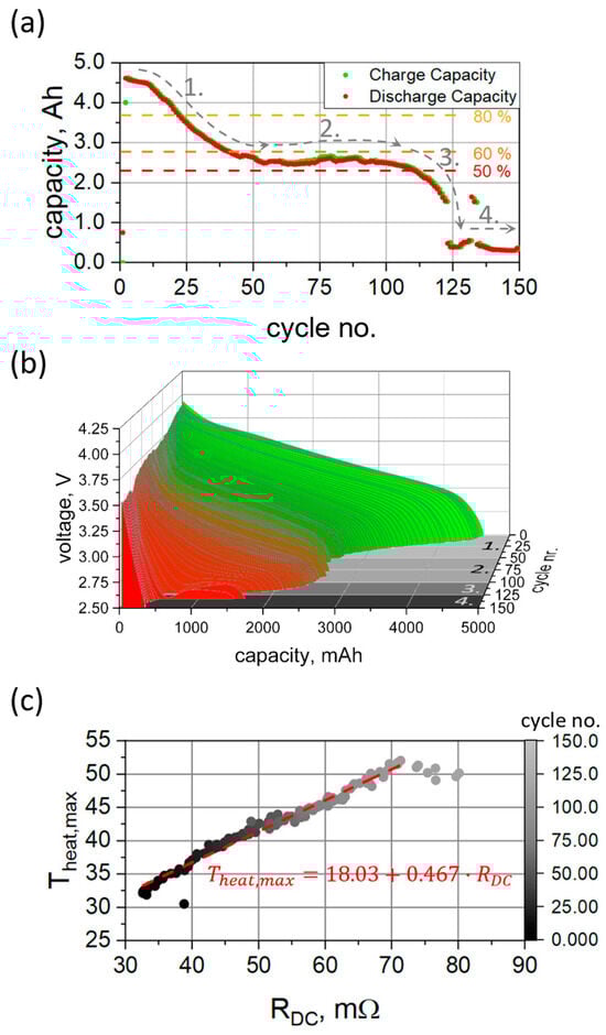 Evolution of remaining cell capacity vs. cycle number (a); Discharge voltage profile vs. cell fatigue (b). Numbers 1–4 correspond to the different regimes observed during cell aging; Maximum recorded temperature upon discharge vs. estimated cell resistance (c). The lines are guides for the eyes.
