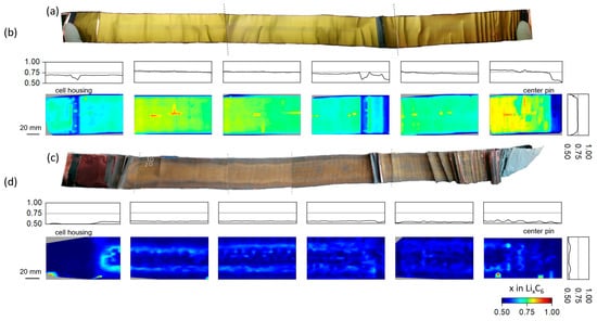 Besides this, two well-resolved lithium concentration maxima of 0.569 and 0.565 x in LixC6 of aged cell can be identified over the electrode width (cell height) at around 14.7 mm (24.5% tot. height) and 44.1 mm (73.5% tot. height), respectively. Similar features are clearly present in both photos of the electrodes (Figure 2c) and the false color representation of the lithium content (Figure 2d). In such context, one has to refer again to the “thickness” averaged character of XRDR and the sensitivity of the visual inspection to the surface of the electrode. Aging-driven color changes of the graphite electrode surface are often observed in the literature, and a grey-red film is typically attributed to the formation of covering/passivation layers on top [56,57,58,59,60,61] as a result of side reactions occurring at the anode during cell cycling.