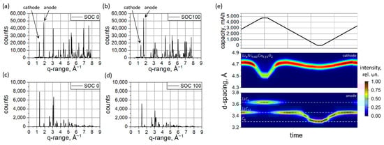 Furthermore, the improved localization capabilities of thermal neutrons compared to X-rays when applied to lithium and/or carbon allow it to be a sensitive probe of the lithium intercalated into the graphite anode. A lithium content of x = 0.855 in LixC6 in the fully charged state was determined. For the sake of comparison, the XRD data characteristics of SOC = 0% and SOC = 100% are presented in Figure 4c,d, accordingly. The different nature of X-ray and neutron scattering entail differences in the diffraction signal from XRD and neutrons. Neutron scattering is isotope-specific, and the diffraction signal using neutrons is dominated by the contribution from the graphite anode, making carbon one of the dominating scatterers in the studied battery type. X-rays interact with the electron subsystem of the atoms, forming a tendency to scatter systematically more strongly on heavier atoms. Therefore, the XRD signal from the studied batteries is dominated by the heavier elements, e.g., Ni, Co, Fe, Cu, etc. Nevertheless, a good separation of the 001 LiC6 and 002 Lix<0.5C6 peaks from other phases and an excellent signal-to-noise ratio enables qualitative analysis of the lithium concentration in the anode from XRD. Thus, a lithium content x = 0.802 was determined in the fully charged anode LixC6 using in operando XRD. This is slightly above the average value determined from the XRDR data but can be attributed to the local character of the in operando XRD measurement, where areas with systematically low lithium content at the edges of the electrodes were not probed. From the in operando data shown in Figure 4e, one can clearly see a structural response of battery electrodes on the lithium extraction and lithiation.