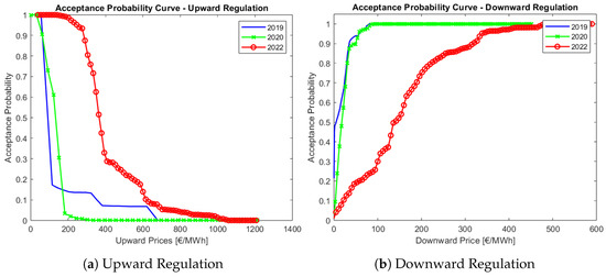 - If (SoC(t)) is lower than the target SoC (), the bid price for downward regulation increases proportionally to the difference between SoC(t) and , increasing the probability of acceptance since downward bids are accepted if the bid price is higher than the minimum downward price.
