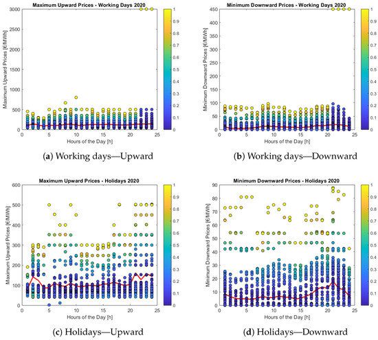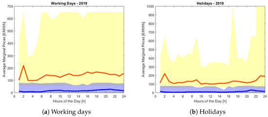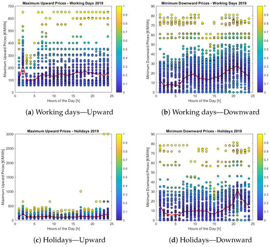 The results of the statistical analysis for 2019, for both working days and holidays, are highlighted in Figure 5a,b, respectively. The red lines represent the hourly average marginal upward prices, while the blue lines correspond to the downward ones. Moreover, the shaded areas highlight the deviations of the hourly maximum and minimum marginal prices over the year from the average values for both regulations. The average upward prices are generally in the range of 100–200 EUR/MWh, with the lowest value around 4:00 a.m. Regarding the downward marginal prices, the graph highlights an almost constant behavior indicating the constant willingness to pay throughout the day.