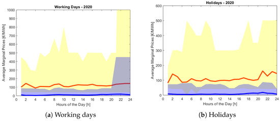 For 2020, the statistical analysis for the upward and downward prices during 2020 highlights the influence of the COVID-19 pandemic on the prices. The results obtained for 2020, for both working days and holidays, are shown in Figure 7a,b, respectively. The average upward prices are generally in the range of EUR 90–150/MWh, which is lower than the case of 2019. The maximum upward price is greater than EUR 1000/MWh during working days, between 9:00 p.m. and 24:00. However, for holidays, the maximum upward price is EUR 500/MWh. Regarding the downward marginal prices, the graph highlights an almost constant behavior indicating the constant willingness to pay throughout the day. The average downward prices range from EUR 5 to 15/MWh, and the minimum value is EUR 0/MWh throughout the year.