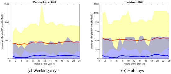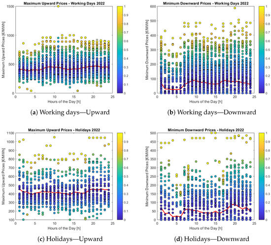 For 2022, the statistical analysis for the upward and downward prices during 2022 highlights the influence of the gas crisis on the prices. The results obtained for 2022, for both working days and holidays, are shown in Figure 9a,b, respectively. The average upward prices are generally in the range of EUR 400–500/MWh, which is higher than the case of 2019. The maximum upward price reaches EUR 1500/MWh during working days. However, the maximum upward price for holidays is around EUR 1000/MWh. Regarding the downward marginal prices, the graph shows a higher variability behavior. The average downward prices are in the range of EUR 50–100/MWh, and the minimum value is EUR 0/MWh throughout the year.