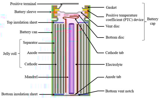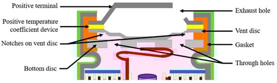 The battery is sealed with a cap located on the top of the cathode tab. A typical cylindrical battery cap structure is displayed in Figure 3. The battery cap is a vital component in the cylindrical battery as it often consists of safety devices to protect the cell from thermal runway and explosion [26]. The cap consists of conductive parts that include the positive temperature coefficient (PTC) thermistor, and the bottom and top disk that act as a current interrupt device (CID) [27]. The cap consists of a non-conductive plastic insert or gasket to insulate the positive terminal from the battery can. The cap provides an electrical connection between the cathode tab to the positive terminal, enabling the transfer of electrical current between the battery’s electrodes and external circuit.