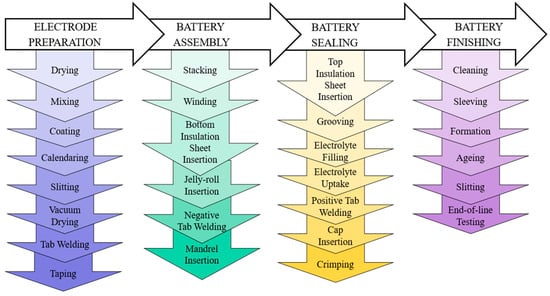 The primary input to a PFMEA is the process flow diagram, which describes the cylindrical battery manufacturing and assembly process. The manufacturing and assembly of a cylindrical battery involve the precise fabrication of battery cans and caps, the preparation of the electrode stack, its assembly into a jellyroll structure, followed by tab welding and assembly into battery can, and the sealing of the battery to ensure no leakage [9,12,35]. These steps, along with thorough quality checks, contribute to the production of reliable cylindrical batteries. To illustrate the overall manufacturing process of a cylindrical lithium-ion battery, Figure 4 provides a representation. This process involves four major steps: electrode preparation, cell assembly, cell sealing, and cell finishing [36].