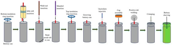 The anode electrode, separator, and cathode electrode will be stacked together and rolled up to form the jelly roll. During the winding process, a center pin can be used to prevent deformation of the electrode assembly. This component is also referred to as a deformation prevention core and is removed once the winding process is complete [42]. An adhesive tape is used to secure the jelly roll. Winding speed, web tension and web edge control influence the quality of the jelly roll. The jelly roll is inserted into the battery can along with a bottom insulator, and the negative tab is welded to the internal surface of the battery can’s bottom. This is a challenging step as the weld should not penetrate the battery can [43].