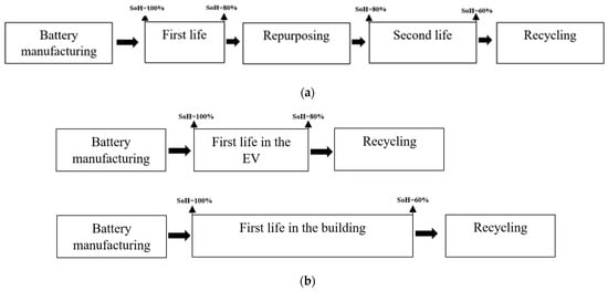 The employment of first- and second-life batteries in building applications studied by Cusenza et al. [28]. (a) Whole life cycle of the battery considering the second-life usage and (b) life cycle of the battery without considering the second-life usage.