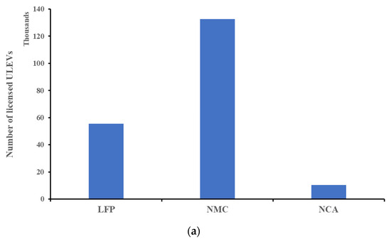 The chemistry of lithium-ion batteries is defined based on their cathode material [46]. There are a large number of batteries with different chemistries available on the market and installed in various electric vehicles. However, due to the restrictions of time for performing experiments in the battery-testing lab, tests may be conducted on a limited number of samples. Accordingly, a study was performed to assess the number of licensed ultra-low-emission vehicles (ULEVs) on the road (Table 1) [47]. The UK government has published statistical data from monitoring the number of ULEVs on the roads in the UK. This data have been downloaded and used to define the most common battery chemistry used in ULEVs in the UK.