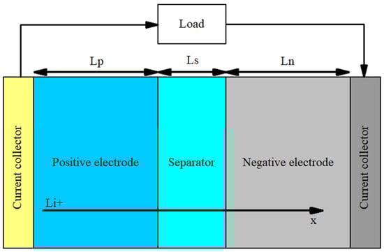 The pseudo-two-dimensional (P2D) model uses partial differential equations to obtain the physico-chemical parameters of the lithium-ion battery during operation [58]. Using this method to model the retired batteries allows the determination of micro-health parameters, offering a multi-dimensional categorisation foundation for these batteries that is used for a detailed state-of-health estimation [37,58]. The computational complexity of the P2D model is reduced by using a single-particle model, which converts it into a simplified P2D model [58]. A schematic diagram of this model is shown in Figure 4. As shown in this figure, the cell is separated into three zones: the negative electrode, the positive electrode, and the separator [59]. In P2D models, there are five partial differential equations used to reflect the electrochemical processes within the cell [59].
