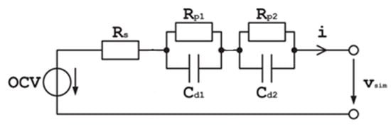 As shown in Figure 5, in the second-order ECM, the OCV, which represents the battery SOC, can be ideally approximated by a voltage source. Rs accounts for the cell’s ohmic resistance. The transient behaviour of the battery is described by the first parallel RC branch (Rp1 and Cd1) and the second RC branch (Rp2 and Cd2). The calculation for the terminal voltage (Vsim) follows the equations below [50]: