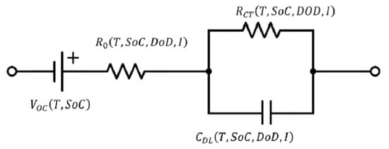 An increment in RCs in the ECM results in higher accuracy while also increasing the simulation time [62]. A first-order ECM is used by many other researchers due to its simple mathematical structure and fast simulation time while providing acceptable accuracy (approximately lower than 2% error) [52,62,63,64]. In a first-order ECM, the battery model diagram includes a resistance (R0) connected in series to a resistance–capacitance network, as shown in Figure 6 [63]. In this figure, the R0, RCT, and CDL represent the battery-cell ohmic resistance, charge-transfer resistance, and double-layer capacitance, respectively. A first-order ECM was also employed by Abdel-Monem et al. [62] to model two second-life batteries with different geometries. They reported the maximum error of the first-order ECM (also named as the Thevenin model or 1RC-ECM) as 1.5% and demonstrated that their model provides accurate dynamic behaviour estimation for second-life batteries used in a stationary energy-storage application.