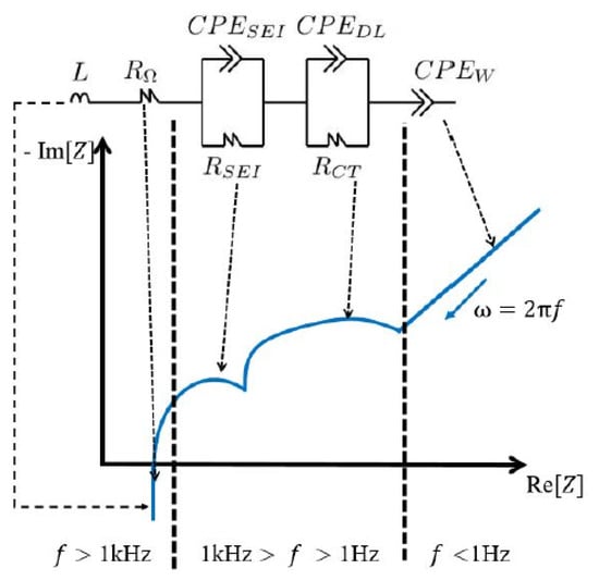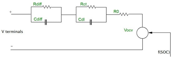 In another study published by Locorotondo et al. [65], the electrical Randles-circuit model, which is a type of ECM, was employed for the modelling of second-life batteries. As demonstrated in Figure 7, this model consists of resistance and constant-phase elements (CPEs) and different RCs. The employment of CPEs leads to better matching of EIS data and the fitted parameters. Moreover, the CPE acts as a capacitor, and it contains two parameters: capacitance and the depression factor. CPEs are conventionally employed in ECM methodologies when the Nyquist diagrams coming from the EIS consist of semi-elliptical arcs. Furthermore, the fitting error has been minimised using the Levenberg–Marquardt algorithm (LMA) during the fitting procedure. More information about the employment of EIS analysis for the modelling of second-life batteries can be found in [66].