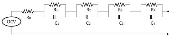 Equivalent-circuit models (ECMs) have been commonly used in most of the recent studies, in which the mathematical model of the second-life batteries is presented. For example, a second-order ECM model was used by Hart et al. [60], enabling them to consider transient voltage (1RC) and long-term transient effects (e.g., relaxation effects) (2RC) in their proposed model [61], which is shown in Figure 5. In that study, the resistance and capacitance parameters were also obtained using electrochemical-impedance spectroscopy (EIS) tests on the battery cells.