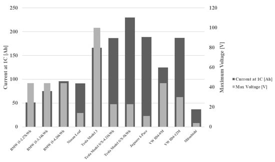 When conducting experimental tests on second-life batteries at both the module and pack levels, the maximum voltage and nominal C-rates of these batteries hold significant importance [36,93,94]. These factors are crucial in ensuring that the battery pack’s voltage aligns well with other components within the intended system. Consequently, selecting the appropriate second-life module with the specific voltage and C-rate becomes pivotal, and this is driven by the technical specifications of the electrical network and the required capacity. The battery parameters for the models listed in Table 4 are visualised in Figure 11 [54]. Notably, a substantial difference between the battery-pack voltage and the consumer voltage can result in considerable energy losses via inverters and converters.