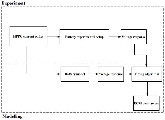 HPPC tests have been performed to characterise the equivalent-circuit battery model for second-life batteries [95]. HPPC current pulses are applied to the second-life battery to obtain its voltage response in various SoCs in the laboratory [96]. After developing the ECM of the proposed SLB, HPPC pulses are applied to the theoretical model as the input current, and the voltage response is compared to the experimental values obtained in the laboratory [97,98]. Following that, optimum values of the ECM parameters in various SOCs are identified using fitting algorithms such as the Levenberg–Marquardt [99,100], trust-region reflective [101,102], and genetic [103,104] algorithms to minimise the error between the voltage response obtained by the model and the experiments. The overall process of the ECM characterisation is presented in Figure 12.