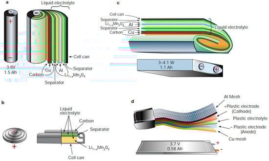 Schematic drawing showing the shape and components of various Li-ion battery configurations: (a) cylindrical; (b) coin; (c) prismatic; and (d) thin and flat. Reprinted from [5], with permission from Springer Nature, Copyright (2001).