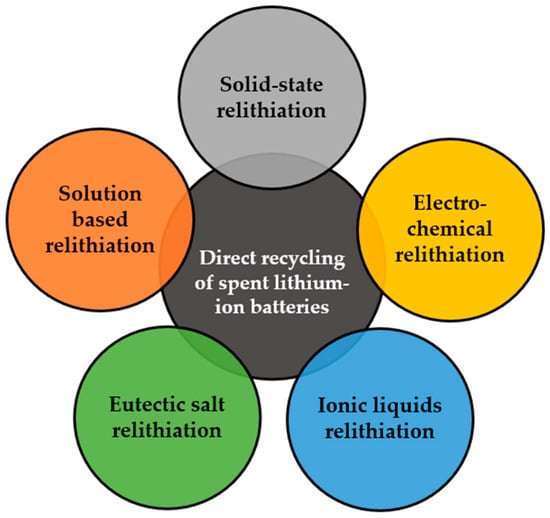 The demand for efficient energy storage systems has propelled research into enhancing the performance of LIBs and their suitable usage within selected application fields [36,37]. Considering the current implementation stage and ratios between spent LIBs designed for EOL treatment, the spent NMC, LFP, LCO, and LMO cathode material treatments were described. More details about spent NCA materials’ direct regeneration are provided, for example, in the study by Elmaataouy et al. [38].
