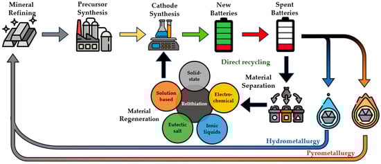 Following pre-treatment, the black mass, primarily comprising the gathered spent cathode materials, undergoes regeneration through either pyrometallurgical, hydrometallurgical, or direct recycling methods. A complex overview of the implemented pyrometallurgy or hydrometallurgy techniques, including a detailed examination of their advantages and disadvantages, along with considerations of economic and environmental perspectives, can be found in works by Pražanová et al. [20], or Lander et al. [24].