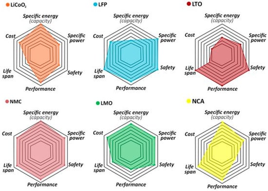 As a critical component of the battery, cathode materials play a crucial role in determining the overall performance, energy density, and efficiency of LIBs, where their differences within specific energy (capacity), specific power, safety, performance, lifespan, and cost are illustrated in Figure 6 [35].