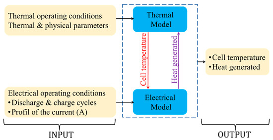 Figure 1 illustrates the global modeling scheme adopted to study the thermal performance of the battery. Two essential fields were combined, i.e., thermal and electrical models. Both models are inputted with input parameters that illustrate the operating conditions of the battery as well the thermal and physical parameters of the battery itself. An electro-thermal coupling was established to predict the heat generated and the temperature of the battery. Regarding the modeling procedure, the following methodology is considered: