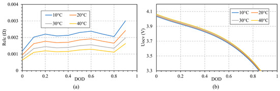The constants a and b represent the fitting parameters to illustrate the influence of DOD on UOCV and Relc. In order to determine these parameters, the experimental voltage data during different constant-current discharge rates and at various DODs have been recorded [24,26]. A linear dependency between the cell voltage and the discharge current applied for various DODs has been observed, as shown in Equation (1), where UOCV depicts the intersection of the (V-I) curve with the voltage axis, and Relc represents the curve slope. A polynomial dependency between the NTGK functional parameters and the DOD has been considered, where a and b are determined by curve fitting the data of UOCV and Relc with the polynomial expression illustrated in Equations (2) and (3). Tref is the reference temperature in K. ω1 and ω2 are constants used to fit the effect of temperature on the electrical parameters of the battery, and they are determined based on Nernst and Arrhenius Laws [27,28]. The plots of UOCV and Relc versus the DOD and at different temperatures are shown in Figure 3. The values of the fitting parameters used in this study are illustrated in Table A2 of Appendix A [11,25].