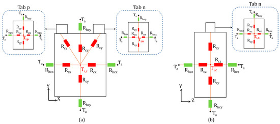 The schematic of the 3D lumped thermal network of the NMC Li-ion cell and tabs in [x–y] and [z–y] axes is shown in Figure 4. As previously mentioned, the cells and terminals of the battery are considered as independent blocks, and each of which is composed of one node located at its center that illustrates its internal temperature and of external nodes that represent the environmental temperature. The internal temperatures of the three blocks, i.e., cell and positive and negative tabs, are denoted by Ti,c, Ti,p, and Ti,n, respectively, while the ambient temperature is represented by the nodes Ta. The heat capacity and mass of each body are assumed to be located at the core node of the corresponding bodies. With regard to the heat, it is generated by the cell and then transferred by conduction to its faces and dissipated by convection to the ambient. A part of the heat is transmitted to the core of each tab by conduction along the y-axis, which in turn, is transferred by conduction to the faces of the latter, and then dissipated to the atmosphere. The red colored thermal resistance (Rc) represents the heat transfer by conduction, while the green colored thermal resistance (Rh) depicts the heat dissipation by convection. The selection of the node placements was influenced by the analysis of other studies concerning the analytical modeling of batteries using thermal resistance network models [9,18,19,20,21,22,23,37]. Moreover, the preliminary results of temperature contour predicted by the finite element model, which is represented later in the Results Section, indicated that the majority of the heat is located between the central and lower sections of the battery, with a thermal discrepancy lower than 0.7 °C, which led us to infer that the node that represents the internal temperature of the cell is located in its center.