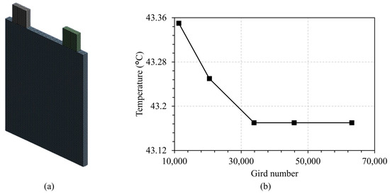 In this Section, the thermal behavior of a single NMC pouch cell during constant discharge cycles was studied by adopting the two models that have been already illustrated. Five values of discharge rates were applied on the battery cell (1C, 2C, 3C, and 4C, and 5C:1C means a current discharging the cell in 1 h, for instance, 1C is 5 A for a 5 Ah battery). The environmental temperature is set at 27 °C (300 K). Natural convection boundary conditions, with a heat coefficient of 5 W/m2 K, are applied to all the faces exposed to air. Both ambient temperature and convection coefficient are considered the same in all the studied cases (cell, module, constant discharge cycles, and periodic cycles). In terms of the finite element modeling, the solid bodies created in Solidworks® 2019 SP2.0 were imported to the software ANSYS Workbench® 2021 R1, where a hexahedral structure mesh was executed, through the meshing tool, with a grid number of 33,839. This number was obtained by running a 5C discharge cycle simulation of the single cell with different number of grids, and the value at which the maximum battery’s temperature at the end of the simulation was seen converging was chosen, as shown in Figure 6. Once the meshing was performed, the model was solved with ANSYS Fluent [38] by applying all the thermal, physical, and boundary conditions.