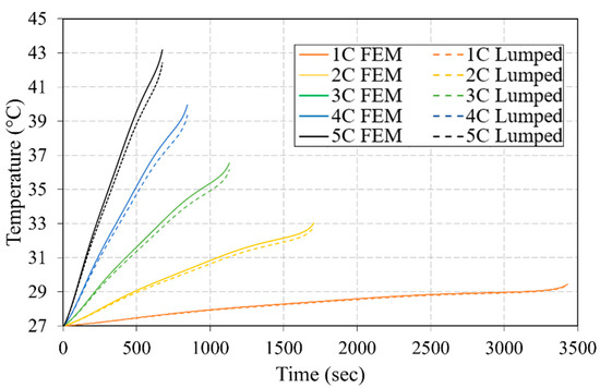 The lumped model was developed and solved in MATLAB [39] by applying Runge Kutta fourth order method to the heat equations. The discharge constant current cycle simulations for both models were carried out with a step time of 1 s and until the battery was fully discharged. The thermal profiles of the Li-ion NMC cell during the five discharge cycles obtained by the two models are illustrated in Figure 7. Close predicted values of the cell temperature during the operating phases are obtained by the two modeling approaches. In both models, the maximum temperature was seen dependent on the C-rate. For instance, each time the C-rate applied increased, the temperature also increased. The thermal profiles obtained by the two models were observed to diverge with time and with the rise in the applied discharge rate. However, this discrepancy remained acceptable as the maximum absolute error between the finite element and lumped models was obtained at the end of constant 5C discharge cycle, with a value of 0.5 °C. Another significant factor that should be taken into consideration when comparing both models is the needed calculation time. The FEM required much longer computational time compared to that of the lumped model. For instance, under a discharge current rate of 1C, the FEM took approximately 6 h to finish the calculations, while the lumped model finished the calculations in approximately 3 s, with a maximum temperature difference of less than 0.1 °C.