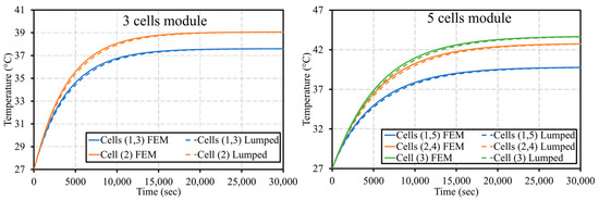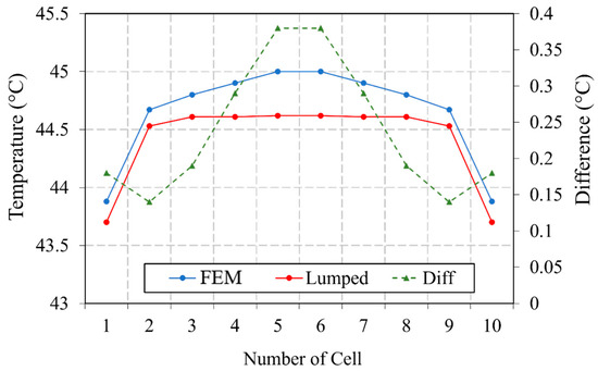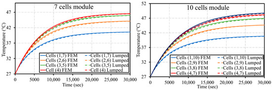 Figure 9 illustrates the maximum temperatures of the cells inside the module of 10 cells estimated by the FEM and the developed lumped model at the end of 5C discharge cycle. Same as the case of a single cell, the simulations for both models were performed with a 1 s step size. An acceptable discrepancy between the two models can be noticed, with a maximum error of approximately 0.4 °C achieved by cell numbers 5 and 6. Same as the FEM, a symmetrical thermal profile was also predicted by the lumped model, with the internally accumulated heat. However, the predicted temperature by the lumped model within the middle cells is more uniform. For instance, cell numbers 3, 4, 5, 6, 7, and 8 achieved almost same temperature (44.6 °C) at the end of the 5C discharge cycle. Noteworthily, the FEM required almost 5 h to predict the temperature, while the lumped model predicted the temperature within 3 s.