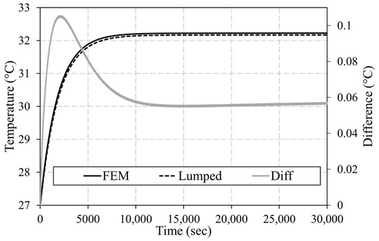 We have observed in the previous Sections that the developed 3D lumped model showed similarity in terms of temperature prediction compared to the reference FEM for the cases of single cell and module with an acceptable error and a low computational time. However, the comparative investigation was conducted only during transient thermal phases of the NMC batteries, where no steady state was achieved for the temperature of the battery. In order to reach a thermal steady state, periodic, consecutive charge/discharge cycles, with a duration of 5 s each and a C-rate of 2C, were applied on the Li-ion pouch’s NMC cell and module. Unlike the previous scenarios, the simulations were carried out with a step size of 5 s, since using a 1 s step time required a very long computational time, especially if the consecutive cycles were applied for a period of 30,000 s. In the current paper, the effect of the time step of the simulation chosen for the thermal effect was not investigated; however, including this study in future research might be beneficial. The value of 2C was only employed for the purpose of comparison between the two modeling approaches. Figure 10 illustrates the maximum temperature evolution of a single cell obtained by the two models during consecutive periodic 2C cycles. Both models showed similar profiles, with the cell achieving its thermal steady state after about 9000 s. The temperature difference was observed to increase with time, during the transient phase, until a maximum value of almost 0.12 °C was achieved. However, this value decreased until the steady state was achieved and remained constant at about 0.06 °C. In terms of the time required to solve the two models, the lumped model predicted the temperature in almost 3.5 s, unlike the FEM that took almost 9 h.