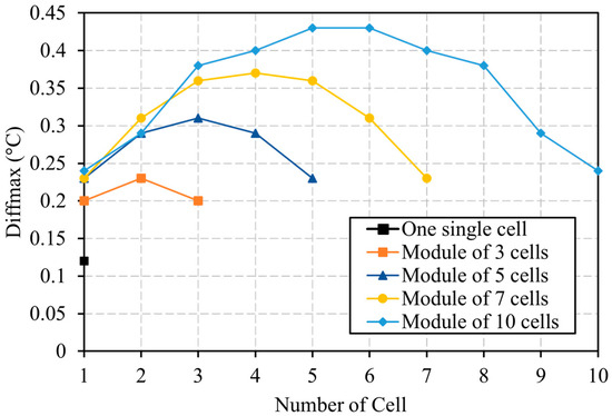 In order to assess the difference between the two models, the maximum difference, Diffmax, of the temperature obtained by both models during the 2C periodic charge/discharge cycles is depicted in Figure 12. The values of Diffmax look very promising, and we can notice that there is almost a consistency in the maximum temperature discrepancy with the number of cells. For instance, a maximum Diffmax for a module of 10 cells is equal to 0.42 °C, which is very close to the maximum Diffmax of a 3-cell module of 0.2 °C. We also observed that the maximum difference between both models was reached for the internal cells. However, it is important to mention that the modeling of the 10-cell module using the FEM took almost 21 h, which is significantly high compared to that of the developed lumped model, which required approximately 6 s to predict the temperature evolution.
