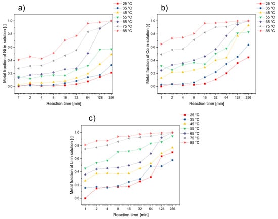 The effect of the reaction temperature (25 °C, 35 °C, 45 °C, 55 °C, 65 °C, 75 °C, 85 °C) and reaction time (1 min, 2 min, 4 min, 8 min, 16 min, 32 min, 64 min, 128 min, 256 min) was evaluated with a gluconic acid (glucono-1.5-lacton, C6H10O6) concentration of 1 mol·L−1, H2O2 concentration of 5 vol.%, solid/liquid (S/L) ratio of 25 g·L−1, and a stirring speed (ω) of 600 rpm. This step is performed to determine the effect of the reaction temperature on the leaching reaction of spent black mass. Figure 1 shows the effect of the reaction temperature on the leaching of cobalt, nickel and lithium at different reaction times. Based on this evaluation, it can be seen that the leaching efficiency of Ni, Co, and Li was increased by rising temperatures and longer leaching durations. These findings are consistent with other literature sources predicting improvement in the leaching of metals at elevated temperatures due to improved kinetic conditions [36].