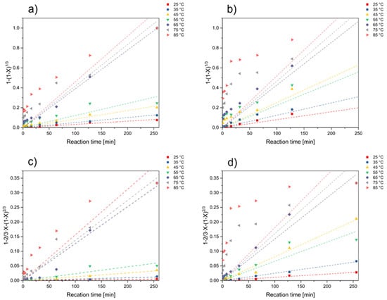 Furthermore, it can be seen that a satisfactory fit of the data is achieved at low temperatures but that this situation deteriorates considerably at higher temperatures. This could be attributed to several factors that complicate the kinetics at elevated temperatures, such as changes in the rate-limiting step due to increased reaction rates, possible formation of secondary phases that could impact the leaching mechanism, or limitations in the model’s ability to capture complex processes occurring at high temperatures. Given these discrepancies, it may be necessary to consider more complex models that can account for multiple concurrent processes or changes in the rate-limiting step with temperature. Additionally, experimental factors such as particle agglomeration, changes in the surface area, or the impact of increased thermal motion at higher temperatures might need to be more thoroughly investigated to provide a comprehensive understanding of the kinetics.