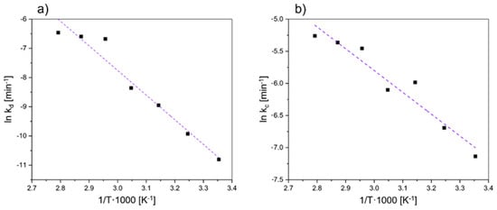 In solid–liquid reactions, diffusion through the product layer or chemical reaction on the material’s surface is typically regulated by reaction rates. Based on the models for these two essential types of rate-limiting steps, the values of the rate constants and their correlation coefficients are shown in Table 2. The diffusion through the product layer on the material’s surface is the limiting stage for the dissolution of nickel, according to a thorough review of the data. For cobalt, the data situation does not seem to be as clear, as it can be concluded from the evaluations that a limitation by the chemical reaction at the reaction surface is to be expected. This different behavior to nickel can be explained by the necessary reduction of Co3+ to Co2+ in order to bring it into solution. This step is not necessary for the leaching of nickel, which explains the limitation of the dissolution of Co by the chemical reaction rate. Here, the correlation coefficients for the case of surface chemical reaction show the highest values and, thus, the best fit. Therefore, the simplified model for the relevant situation was used to linearize the values acquired from experiments related to temperature and acid content (see Equations (5) and (6)).
