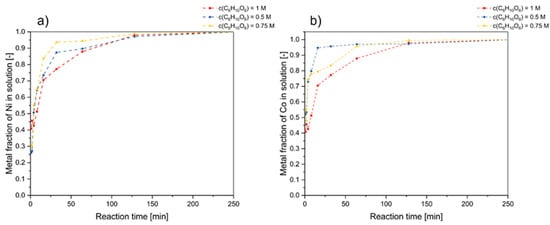 The elucidation of the reaction order holds paramount significance in achieving a comprehensive portrayal of a reaction’s kinetics. Within this investigation, a series of experiments were conducted at a temperature of 85 °C, maintaining a consistent solid-to-liquid (S/L) ratio of 25 g·L−1, coupled with a supply of 5 vol.% H2O2. These experiments were performed under varying acid concentrations (0.5, 0.75, and 1 M) with the primary objective of ascertaining the aforementioned reaction order. The subsequent analysis of the concentrations of nickel and cobalt within the resultant solutions juxtaposed against the reaction duration is graphically depicted in Figure 4.