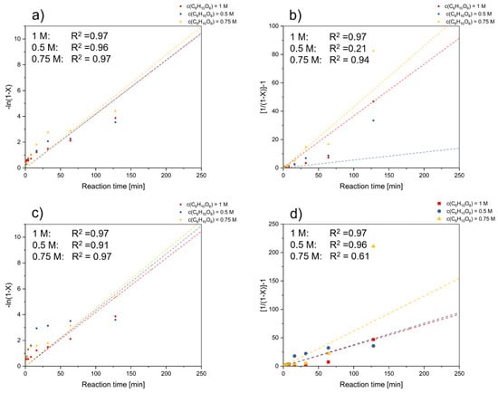 Plot of the shrinking core model for the effect of concentration on the reaction rate in dependence of reaction time based on a first-order reaction model for (a) nickel and (c) cobalt, as well as based on the second order reaction model for (b) nickel and (d) cobalt.