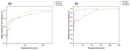 Subsequently, the leaching mechanism was analyzed regarding the corresponding nickel and cobalt dissolution, and models were applied to interpret the data for the aforementioned particle size categories (arithmetic mean value, see Table 4).
