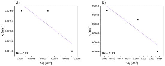 To elucidate the pivotal rate-determining step in this investigation, the kinetic analyses were elaborated, as illustrated in Figure 7. These analyses involved the linearization of kinetic data using Equation (5). In cases where the reaction rate is predominantly controlled by chemical reaction, there exists a linear correlation between the apparent rate constant and the reciprocal value of the particle radius, represented as 1/r0. As shown in Figure 7, a linear relationship between k and 1/r0 values could indeed be observed, affirming that the rate-limiting step in this process is the chemical reaction for cobalt. In comparison, a linearization of the data for nickel shows a dependence on the representation 1/r02, which in turn supports the assumption of a diffusion-controlled reaction. The values for the correlation coefficient, which are significantly below 0.9, can be attributed to the inhomogeneity of the input material, and corresponding deviations can, therefore, not be completely ruled out.