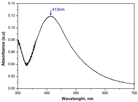 In Figure 1, the UV-Vis spectrum of a 5 mM AgNO3 solution containing silver nanoparticles obtained by treatment in an ultrasonic bath at 50 °C is shown. The figure shows an absorption peak with a maximum at a wavelength around 413 nm, characteristic of spherical particles. The appearance of this peak in the spectrum is due to the Surface Plasmon Resonance (SPR) and is associated with the formation of silver particles of colloidal size. As a consequence of the successfully synthesized nanoparticles, we continued with their further integration into our materials.