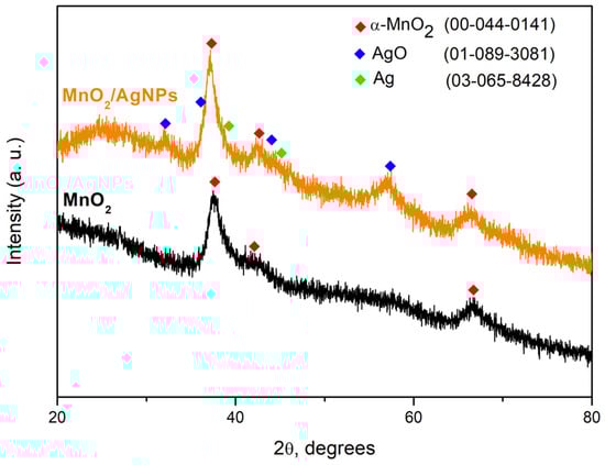Figure 2 presents the X-ray diffraction (XRD) results of the obtained materials without being normalized. The appearance of broad peaks in the XRD patterns of both samples indicates the fine dispersity of the materials. The diffractogram of the synthesized MnO2 shows a pronounced peak at 37.52° 2θ. The appearance of broader peaks with lower intensity at 25.71° and 66.69° 2θ corresponds to the (211), (220) and (112) planes characteristic of the α-MnO2 structure. In the composite material MnO2/AgNP, the increase in the intensity of the MnO2 main peak can be associated with the presence of the introduced Ag nanoparticles and their partial oxidation as a result of the additional thermal treatment of the material at a temperature of about 200 °C. The main peak of MnO2 overlaps with those of the cubic structure of Ag in the (111) direction at 37.71° 2θ, also of monoclinic AgO at 37.23 2θ. The availability of AgO was proven by the appearance of its main peak at 32.33° and others at 39.43 and 56.76 2θ, corresponding to the (−111), (−202) and (−113) crystallographic planes of the monoclinic structure of AgO.