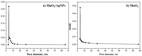 The pore size distribution of MnO2/AgNP and MnO2 is shown in Figure 3, and Table 3 presents the main characteristics and active surface area of both materials.