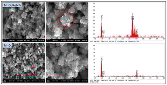 The SEM images of both samples (Figure 4) show multiple irregularly shaped particles as well as individual larger agglomerates. The particle size ranges from approximately 300 to 900 nm. In the MnO2/AgNP composite, lighter particles (under 100 nm) were observed located on the MnO2 surface (Figure 4, highlighted in red). It is assumed that these are AgNPs, in agreement with the results of UV-VIS and XRD analyses. The morphological observation confirms the conclusions already drawn regarding the nanostructural nature of the materials. EDX analysis also shows a clear high-intensity peak with energy corresponding to Ag in the MnO2/AgNP sample, while this peak is absent in pure MnO2. The presence of K recorded in the spectra of both samples is related to the unreacted KMnO4, as previously discussed.