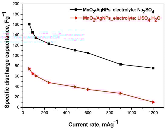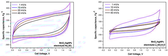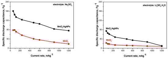 The results of galvanostatic charge–discharge tests carried out at different current loads (0.3–1.2 Ag−1) of MnO2/AgNP composite electrode supercapacitors in different electrolytes (respectively 1 M Na2SO4 and 1M Li2SO4·H2O) are presented in Figure 8. It can be seen that the solid-state supercapacitor using the Na+-form Aquivion membrane shows the highest and most stable specific discharge capacitance (161 Fg−1–75 Fg−1), followed by Li2SO4·H2O (75 Fg−1–10 Fg−1). These data are consistent with the literature data showing that the neutral electrolyte is suitable for pseudocapacitive materials, especially those based on MnO2 [29]. Furthermore, the capacitive characteristics are due to the different conductivity of the electrolyte and its interaction with the functional groups of the electrode material [30].