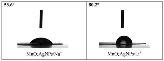 The different wettability of the electrode materials from the electrolyte is also a possible reason for the obtained result. It is well known that surface wettability effects affect the thermodynamic and dynamic properties of electrochemical energy storage systems [31] and can contribute to increasing the effective surface area, improving the specific capacitance and also the energy density of supercapacitors [32]. To this end, in the present study, the wetting angle of MnO2/AgNP electrodes versus Na2SO4 and Li2SO4 electrolytes was measured (Figure 9).