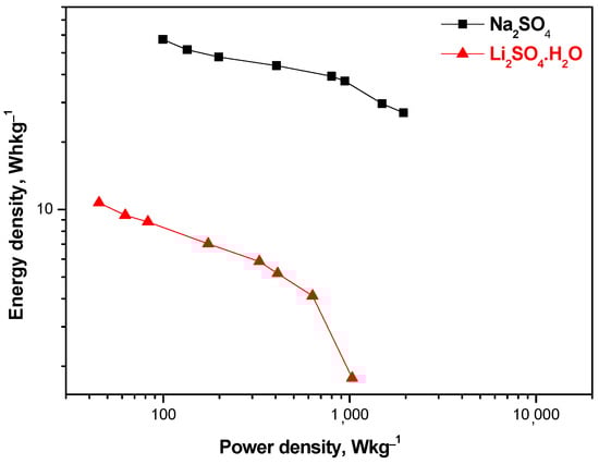 The good supercapacitive properties of hybrid devices with a MnO2/AgNPs positive electrode and Na+ electrolyte can be seen from the Ragone plot. The comparative curves of cells using the Li+-exchange Aquivion membrane show lower energy values compared to Na+ (Figure 10).