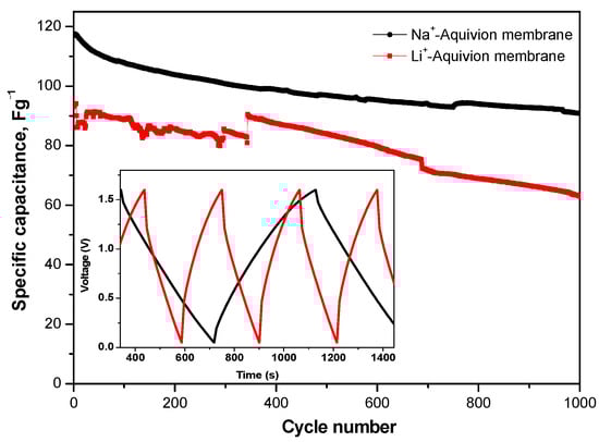 Long-term GCD tests at 240 mAg-1 for supercapacitors with MnO2/AgNP using Na+- and Li+-form of Aquivion electrolyte membrane. Inset figure—charge–discharge profile.